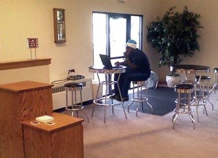 Kahleel Rider was one of several adults and youth who recently helped move furniture, creating a new area to hang out on Sunday mornings in the lobby. Kahleel is using the church’s WiFi to locate songs on iTunes. On Sundays the Welcome Center staff roll out the coffee machine and snacks for all to enjoy. Many thanks to Jim Wilson for creating the new Welcome desk set seen in the lower left corner of the picture.